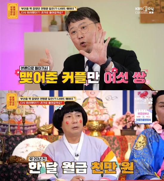 20년 전 천명훈 닮은 꼴로 유명했다는 사연자. 그는 "제가 부킹의 신이다. 웨이터를 할 때 인기도 많고 돈도 많이 벌었다. 월에 천만 원 가까이 벌었다. 나이트 클럽에서 결혼까지 성사시킨 커플만 여섯 커플 정도 된다. 그중 다섯 커플은 이혼을 했다"라고 민망해했다.
