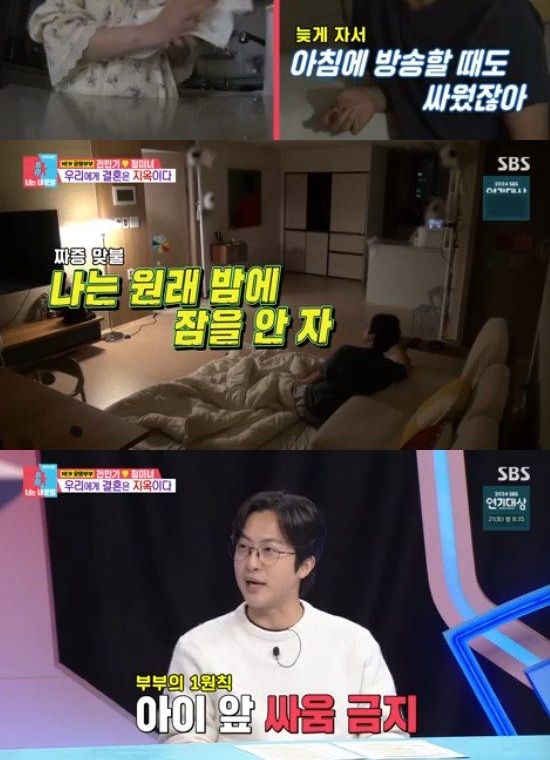 전민기는 "그동안 제가 일어나지는 않았지만 소리를 다 듣고 있었다. 알지만 그냥 참고 넘어갔던 것"이라고 짜증을 낸 이유를 전했다. 서장훈은 "그런데 아이가 꺨 수도 있는데"라고 하자 "아이가 잠들면 잘 안깬다. 저희가 아이 앞에서는 싸우지 말자고 약속했다. 그래서 아이가 잘 때 싸운다"고 말해 웃음을 줬다.