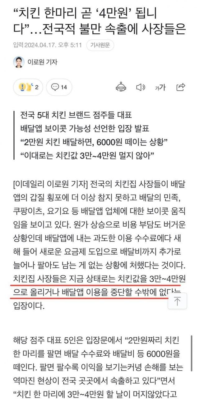 치킨 가격 이제 4만원으로 인상 고려중