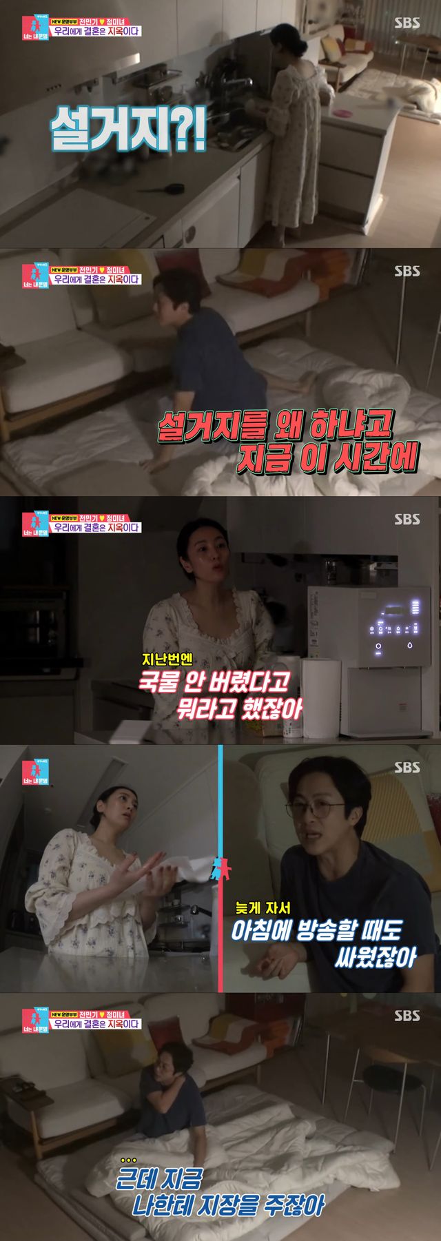 정미녀는 “국물 냄새 때문에”라고 답했다. 이에 전민기는 “다 마셔라. 지난 번에는 설거지 안 하더니 왜 그러냐”고 반문했다. 정미녀는 “지난번엔 국물 안 버렸다고 뭐라고 했다. 설거지 왜 안 했냐고”라고 말했고 전민기는 “지금 몇 시냐. 새벽 3시가 다 됐다. 다 떠나서 내일 일이 있다”며 분노했다. 이어 전민기는 “잠을 자야 에너지가 생기고 일을 한다. 지난번에도 늦게 자서 아침에 방송할 때 싸웠다”고 덧붙였다.
