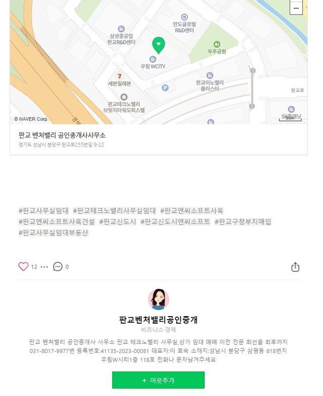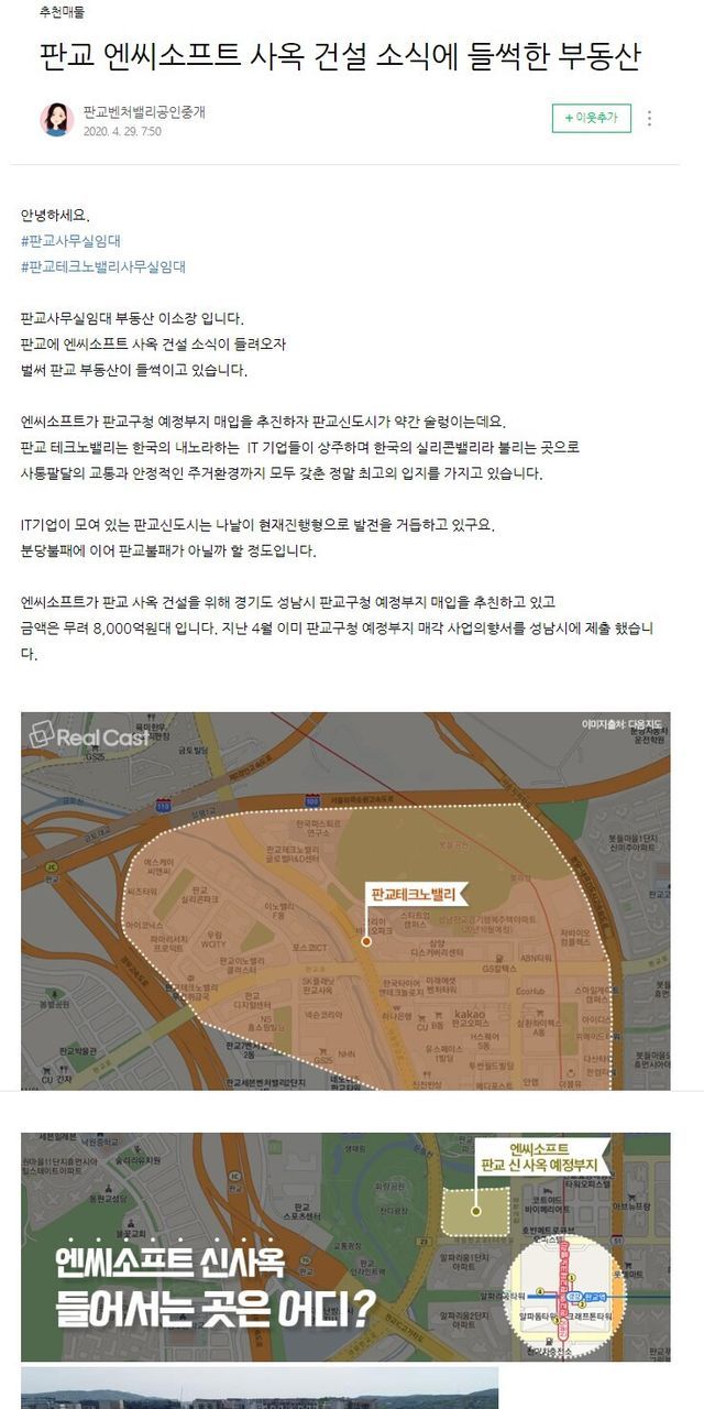 블로그 글을 보면 엔씨 주가가 최고점인 100만원을 찍기 1년 전에 이미 진행되고 있던 부동산 매입이다.