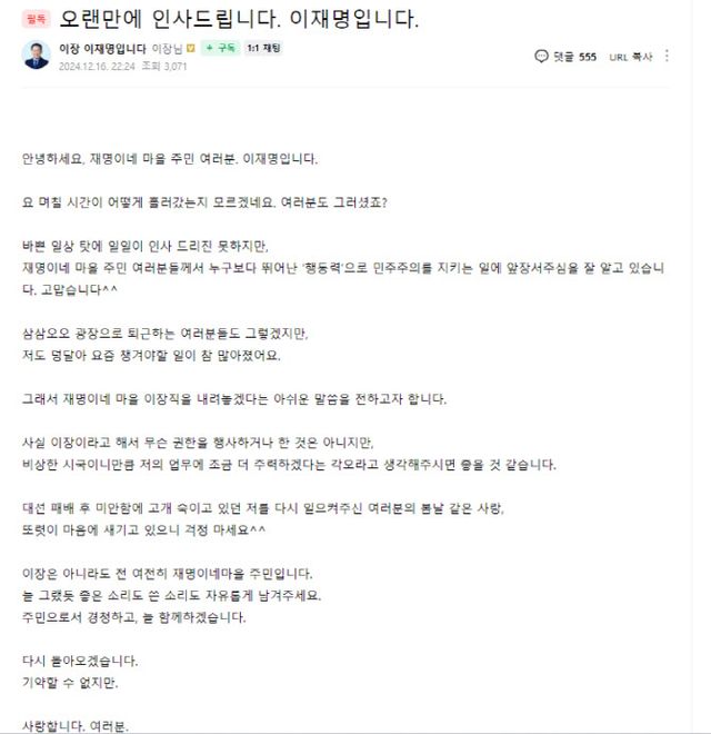 이날 이 대표는 ‘오랜만에 인사드립니다. 이재명입니다’라는 제목의 글을 올리고 “재명이네 마을 이장직을 내려놓겠다는 아쉬운 말씀을 전하고자 한다”고 밝혔다.