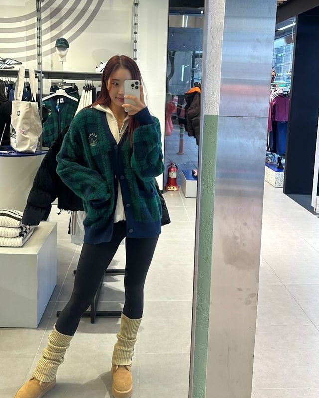 사진 속 유현주는 네이비톤의 레깅스에 루즈핏한 크롭 블랙 라운드 티셔츠를 매칭한 모습이다. 이는 유현주의 빨간 머리와 어울려 과감하면서도 쿨한 매력으로 시선을 사로잡는다.