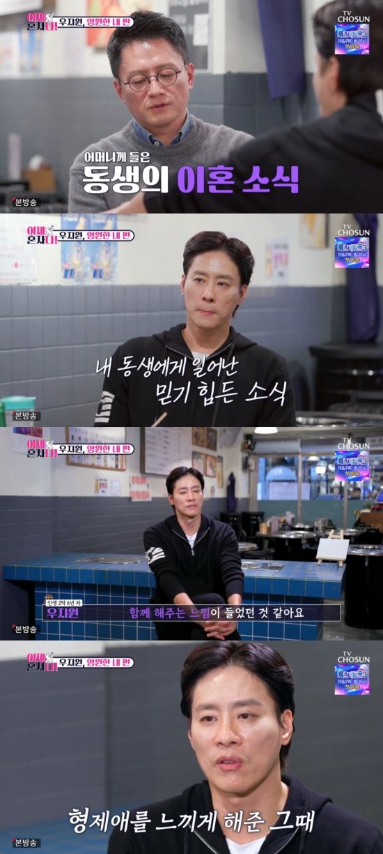 또 우지원 형은 우지원의 이혼 당시 심경에 대해 "사실은 네가 아니라 어머니한테 그 얘기를 먼저 들었었어. 어머니한테 듣고 나서 내 마음이 너무 힘들더라고. 내 동생 지원이가. 굉장히 좀 뭐랄까 너한테 말을 하고 위로를 해주고 뭔가 해 줘야 될 것 같은데 아무것도 할 수 없는 그런 상황에서 내가 너한테 전화를 했던 거 같다. 오히려 그때 네가 나를 '형 괜찮아. 왜 그래?' 오히려 위로 아닌 말을 했을 때 난 그게 더 마음이 아프더라"라며 고백했다.