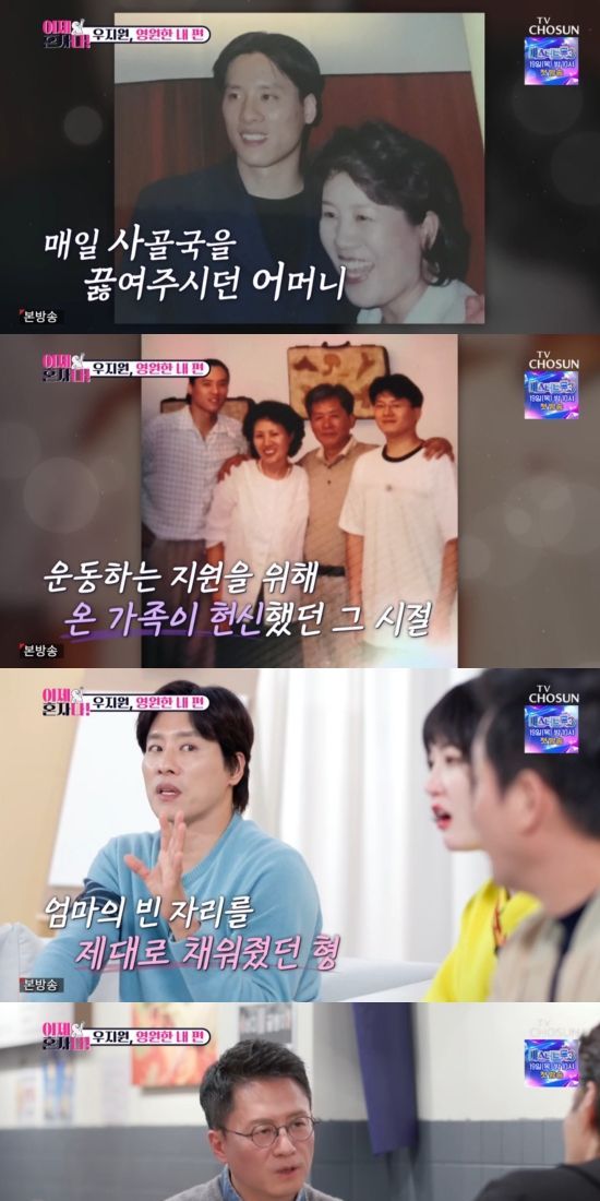 우지원은 "어렸을 때부터 운동을 시작해서 아버지, 어머니가 고생을 많이 하셨다. 어머니가 곰국 같은 거 많이 집에서 음식 만드셔서 오시면 연대 숙소 뒤에 조용한 곳에 가서 어머님이 해 주신 곰국 마시면서 다 먹고 받아서 바로 또 가시고 그다음 날 또 오시고. 뒤에서 묵묵히 응원해 주시는 그런 분이었던 거 같다. (아버지, 어머니) 두 분 다"라며 밝혔다.