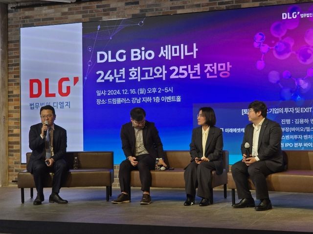 김용하 법무법인 디엘지 파트너 변호사(왼쪽부터), 김한수 미래에셋캐피탈 신성장투자 2본부장(바이오/헬스케어) 상무, 정선영 메디톡스벤처투자 벤처투자팀 상무, 강병준 대신증권 IPO본부 바이오담당 차장이 서울 드림플러스 강남 이벤트홀에서 법무법인 디엘지 주최로 16일 열린 '바이오 산업, 24년 회고와 25년 전망' 세미나에서 패널토론을 진행하고 있다. 사진=이병현 기자
