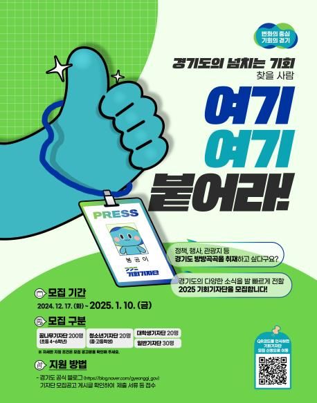 지원은 12월 17일부터 2025년 1월 10일까지이며, 지원서와 지정 주제 취재 기사 1편을 작성해 온라인으로 제출하면 된다. 자세한 지원 방법은 경기도 누리집과 경기도 공식 블로그를 통해 확인할 수 있으며, 선발 결과는 내년 1월 21일 경기도 공식 블로그를 통해 발표된다.