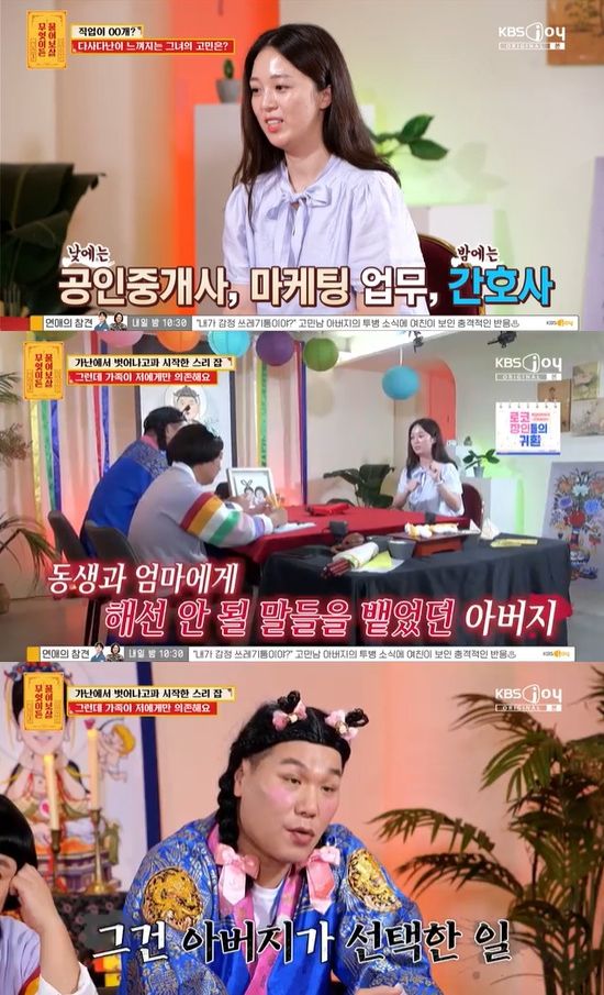 마케팅, 공인중개사, 간호사까지 겸하고 있다는 사연자. 가족이 모두 본인에게만 의존하는 게 고민이라고. 서장훈이 가족 관계를 묻자 그는 "아버지는 돌아가시고 엄마, 남동생 둘, 저 4명이다"라고 밝혔다.