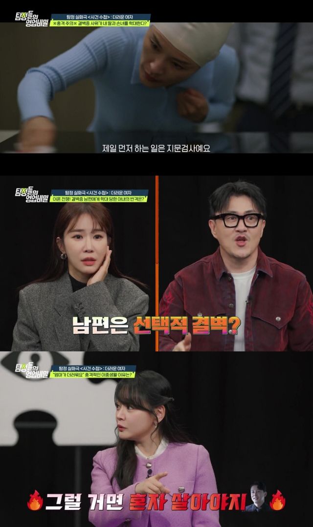 사연 속 탐정은 이혼을 권유하며 아내에게 ‘홈캠’ 녹화와 함께 객관적으로 상황을 보라고 추천했다. 아내는 남편이 오면 수영모를 쓰고 머리카락을 가렸고, 남편이 뿌리는 소독제에 범벅된 상태로 지문조차 용납하지 않는 모욕적인 청결 검사를 일상적으로 요구당하고 있었다.