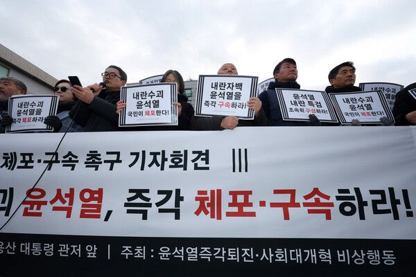 '윤석열 즉각퇴진·사회대개혁 비상행동' 회원들이 17일 오전 서울 용산구 윤석열 대통령 관저 인근에서 '윤 대통령 체포·구속 촉구 기자회견'을 열고 있다. /사진=뉴시스