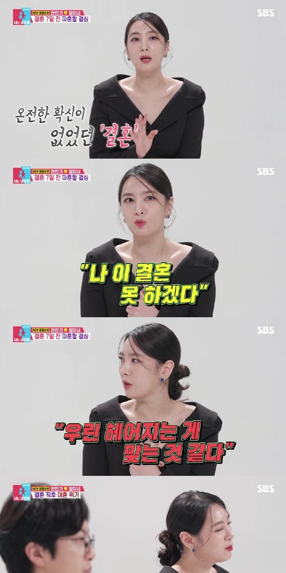 정미녀는 "전민기와 연애할 때도 쉽지 않았다"며 "결혼식 일주일 앞두고 '나 이 결혼 못 하겠다. 헤어지겠다'고 파혼 선언도 했다. '연애는 계속 못 하겠다'라는 생각을 하고 있었는데 당시 남편이 결혼 적령기라 시댁에서는 결혼을 빨리했으면 했다"고 결혼 전 파혼까지 생각했다고 밝혀 놀라움을 자아냈다.