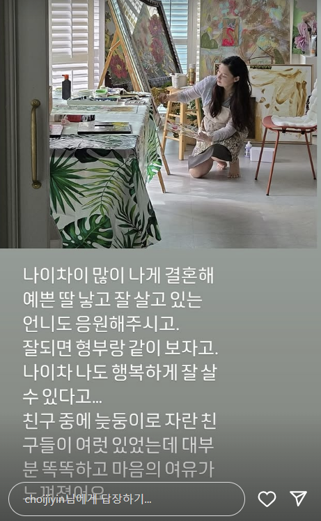 16일 최지인은 자신의 SNS에 “차이 많이 나게 결혼해 예쁜 딸 낳고 잘살고 있는 언니도 응원해주시고. 잘 되면 형부랑 같이 보자고. 나이 차 나도 행복하게 잘 살 수 있다”고 적었다.