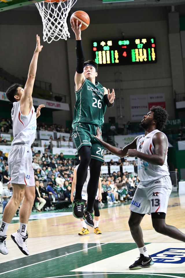 DB는 지난 16일 수원 KT와 홈경기를 72-66으로 승리했다. 3쿼터 초반 14점 차로 앞서다가 3점슛을 4개 연속 허용한 끝에 역전을 내줬지만, 경기 마지막까지 접전을 펼친 끝에 값진 승리를 수확했다.