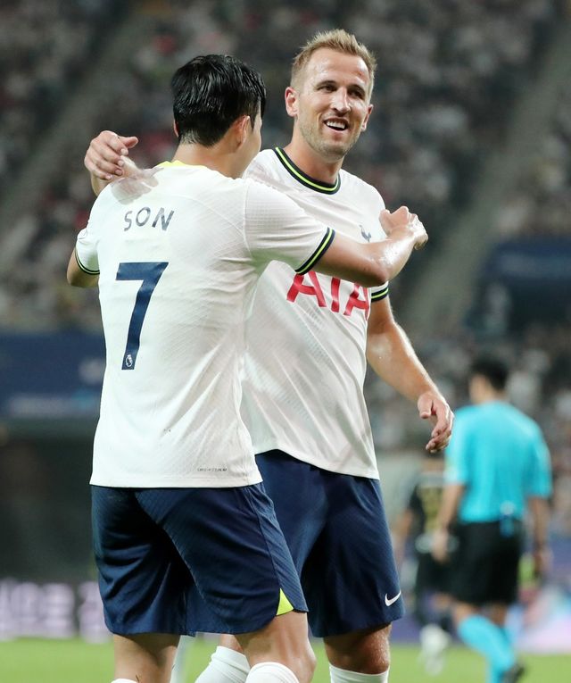 토트넘 홋스퍼의 손흥민이 2022년 7월 13일 오후 서울 마포구 상암동 서울월드컵경기장에서 열린 쿠팡플레이 시리즈 팀 K리그와의 경기에서 후반 두 번째 골을 넣은 후 케인의 축하를 받고 있다. / 뉴스1