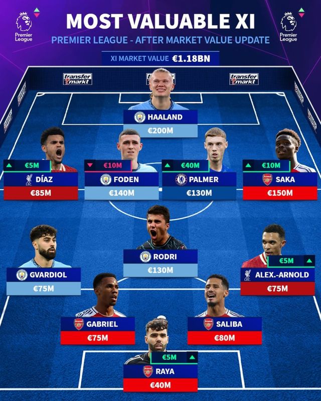 매체가 꾸린 몸값 베스트11의 시장 가치 총합은 무려 11억 8000만 유로(약 1조 7820억원)에 달했다. 엘링 홀란(맨체스터 시티)이 2억 유로(약 3020억원)로 11명 중 가장 높았다. 부카요 사카(아스널)가 1억 5000만 유로(약 2265억원), 필 포든(맨시티)이 1억 4000만 유로(약 2115억원)로 뒤를 이었다. 로드리(맨시티) 콜 팔머(첼시)는 1억 3000만 유로(약 1960억원)로 책정됐다.