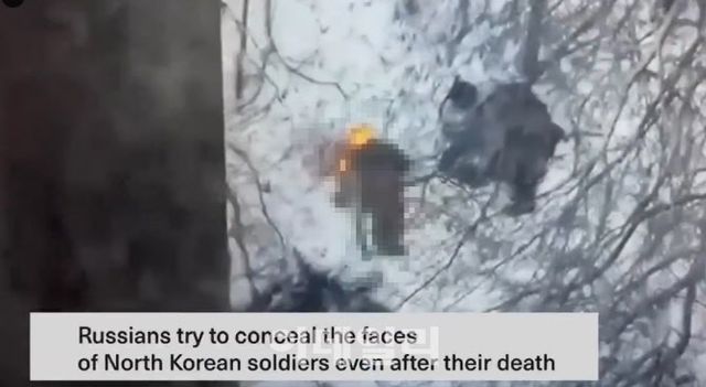 영상에는 산속에서 사체로 추정되는 물체의 일부분에 불이 붙어있고 사람이 옆에 서있다. 영상에는 “러시아는 북한 병사들이 죽은 뒤에도 얼굴을 감추려 하고 있다”는 영어 자막이 달렸다.