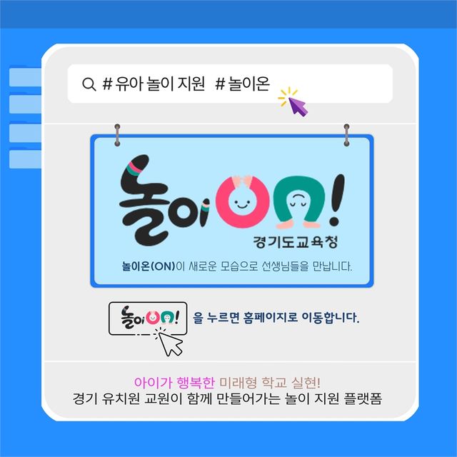 ‘놀이온’은 경기 유치원 교원들이 직접 만들어가는 놀이 지원 플랫폼으로, 유아 놀이, 교사 연구, 부모 지원을 위한 자료를 개발하고 공유하는 기반이다. 체험교육원은 2024년 운영을 위해 공‧사립유치원 교원 25명으로 구성된 지원단을 통해 현장 수요를 반영한 교육자료를 개발하고 보급해왔다.