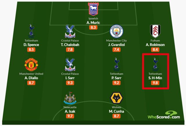 손흥민은 17일(한국시간) 통계 매체 후스코어드닷컴이 선정한 2024~25 잉글랜드 프리미어리그(EPL) 주간 베스트11에서 4-4-2 전형의 왼쪽 측면 공격수로 이름을 올렸다.