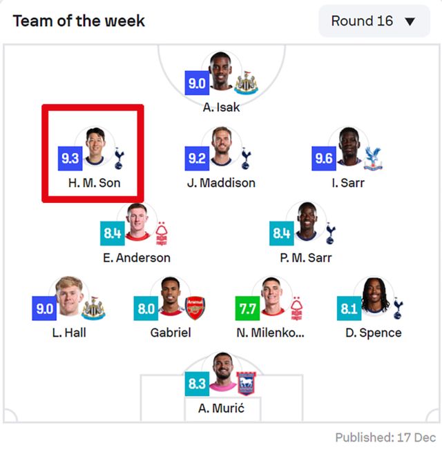 손흥민은 또 폿몹 평점에서도 9.1점을 받아 EPL 16라운드를 빛낸 베스트11에 당당히 이름을 올렸다. 평점에선 이스마일라 사르(9.4점), 매디슨(9.2점)에 이어 세 번째로 높았다.