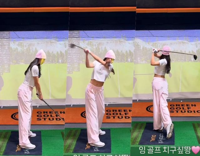 신수지는 이날 흰색 크롭톱과 분홍색 비니와 트레이닝 팬츠를 매치해 러블리한 패션을 완성했다. 특히 그가 공개한 영상에는 스윙을 하는 모습이 담겼는데, 포즈를 취하자 허리 라인이 드러나며 탄탄한 몸매가 돋보였다.