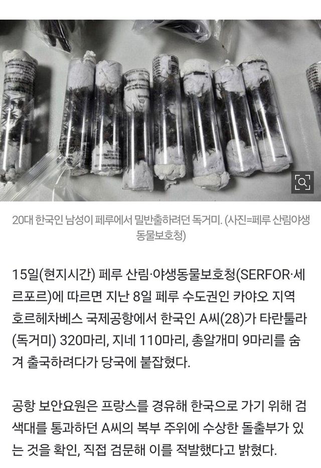 • 페루 공항에서 한국인 남성이 타란툴라 320마리, 지네 110마리, 총알개미 9마리를 숨겨 출국하려다 적발됐다.