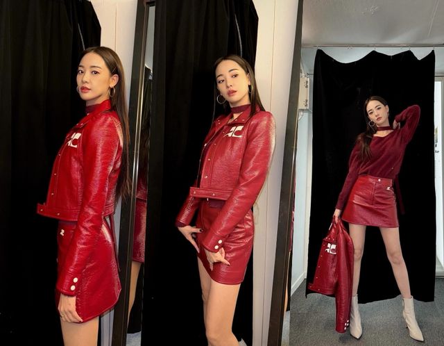 사진 속 이주연은 강렬한 레드 컬러 재킷과 미니 스커트를 입고 이너로는 와인 색상의 니트를 착용한 모습이다. 여기에 베이지 색상의 앵클 부츠를 착용해 포인트를 더했다.
