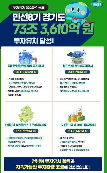 경기도는 민선 8기가 시작된 2022년 7월부터 올해 11월 30일을 기준으로 약 73조 3,610억 원의 투자유치를 달성했다. 2년 4개월여 만에 목표 투자액(100조 원)의 약 73%를 달성한 셈이다.
