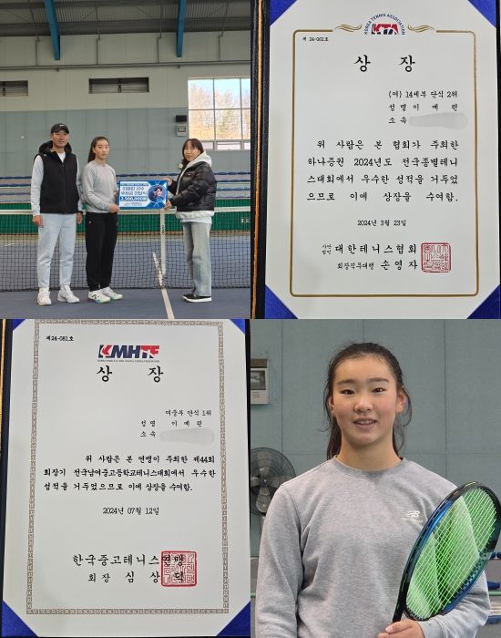 이예린 선수는 중학교 1학년인 테니스 유망주다. 그는 한국 중고 테니스 연맹 주최 '제44회 회장기 전국 남녀 중고등학교 테니스 대회' 여중부 단식 1위, 대한 테니스 협회 주최 '하나증권 2024 전국 종별 테니스 대회' 여자 14세부 단식 2위 등 여러 대회에서 우수한 성적을 거두고 있다.