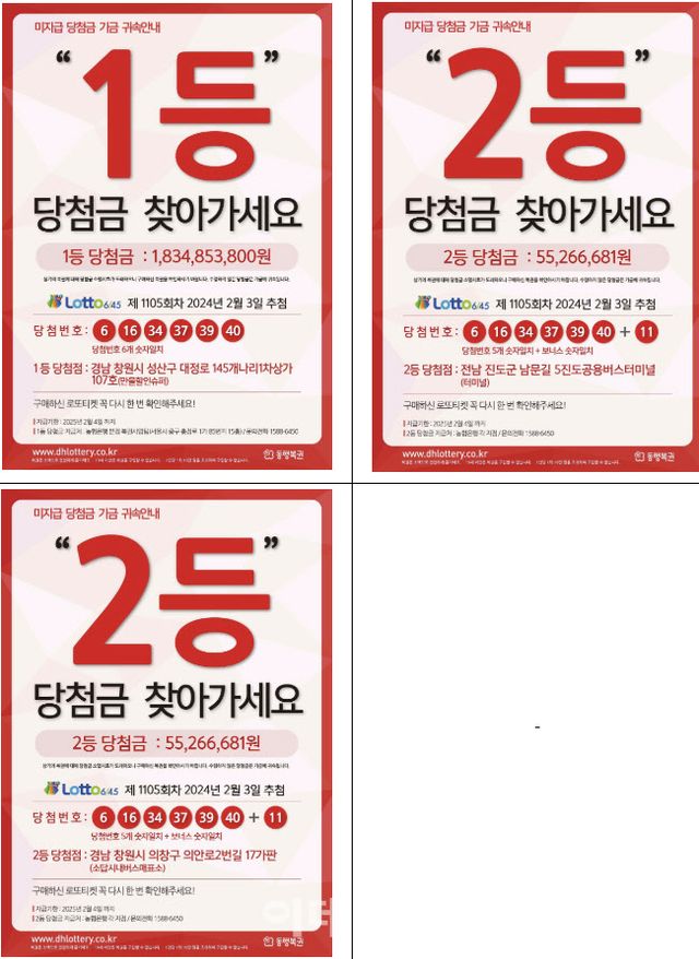 1105회차 미수령 당첨금은 1등 한 명, 2등 두 명이다. 내년 2월 4일에 지급기한이 만료된다. 미수령한 1등 당첨금액은 18억 3485만 3800원이다. 당첨번호는 ‘6, 16, 34, 37, 39, 40’이다. 미수령 당첨자가 복권을 구매한 장소는 경남 창원시 성산구에 위치한 복권 판매점이다.