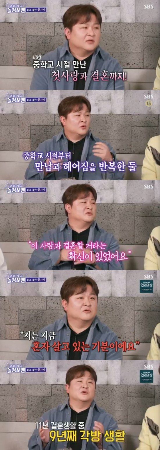 결혼 11년차 허각은 9년째 각방을 쓰고 있다고. "저는 지금 혼자 살고 있는 기분이다. 9년째 각방을 쓴다. 저만의 공간이 필요하다고 생각하고 잠버릇도 다르다. 그리고 아이가 태어나면서 자연스럽게 나뉘더라"라며 설명을 더했다.