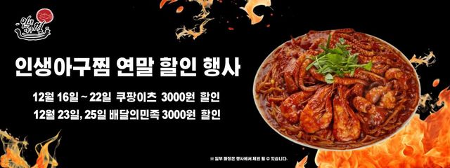 배달 아귀찜·해물찜 전문 프랜차이즈 인생아구찜은 연말, 크리스마스 시즌을 맞아 쿠팡이츠와 배달의민족에서 3000원 할인 혜택을 제공한다. 쿠팡이츠는 오는 22일까지, 배달의민족은 23일과 25일 진행된다.