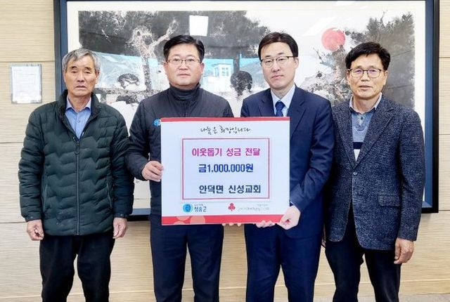 [파이낸셜경제=김예빈 기자] 청송군은 안덕면 신성교회에서 지난 16일 안덕면 행정복지센터에 이웃돕기 성금 100만 원을 전달했다고 밝혔다.