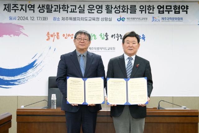 [파이낸셜경제=김영란 기자] 제주특별자치도교육청과 제주과학문화협회은 17일 도교육청 상황실에서 제주지역 생활과학교실 운영 활성화를 위한 협력 체제 구축을 위해 업무협약을 체결했다.