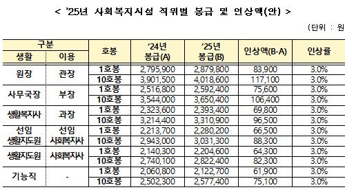 이번 회의에서는 사회복지시설 종사자의 인건비를 올해 대비 3% 인상하는 것을 주요 내용으로 하는 ‘25년 사회복지시설 종사자 인건비 가이드라인’이 심의·의결됐다. 3%는 내년도 공무원 보수 인상률과 동일하다.