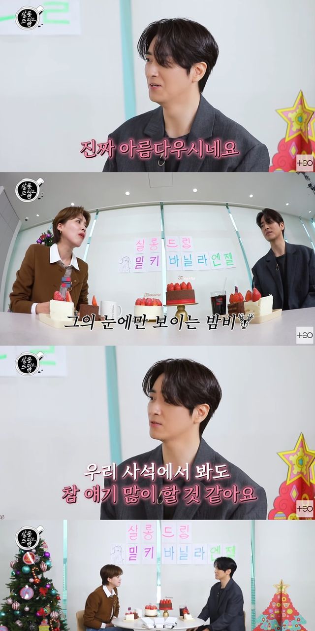 이준혁은 "실제로 보니 더 아름다우시다"고 돌직구를 날리며 "진짜 아름답다. 일단 피부가 너무 좋다. 말이 안 될 정도다. 눈도 되게 맑으시다"라며 연신 칭찬했고 장도연은 "이따 저한테 고백하시겠다"고 돌직구를 날려 웃음을 자아냈다.