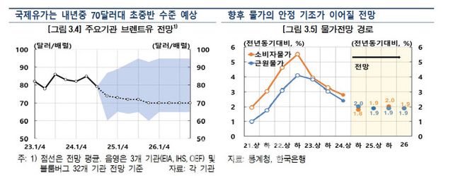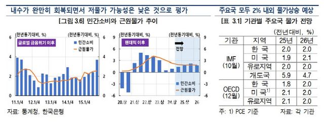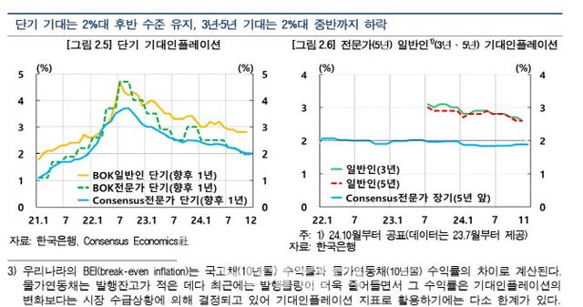 아울러 최근 물가상승률이 목표치에 비해 낮은 수준을 이어가면서 경제 전반적으로 물가가 하락하는 ‘디플레이션’에 대한 우려까지 나오고 있는 것에 대해서는 가능성이 낮다고 판단했다. 한은은 “최근 물가가 1%대로 낮아져 있지만, 2025~2026년 중에 1% 이하의 저인플레이션 국면으로 진입할 가능성은 낮다”며 “최근 공급·수요측 물가 압력이 제한적이지만 향후 국내경제가 1%대 후반의 성장세를 나타내고, 근원물가와 밀접한 민간소비도 2% 안팎의 증가세를 보일 것으로 전망되기 때문”이라고 설명했다. 그동안 누적된 비용 상승 압력이 남아있고 강달러 기조와 이상기후 등의 물가 상승 요인이 지속될 가능성도 크다고 덧붙였다.