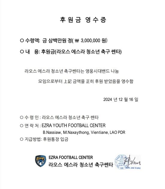 '영웅시대 밴드'(나눔모임)는 "연말을 맞이해 열악한 여건 속에서도 축구를 통해 미래를 꿈꾸는 라오스 유·청소년들에게 힘이 되고자 후원금을 전달했다"라며, "후원금이 필요한 곳에 유익하게 사용되기를 바란다"라고 당부했다.