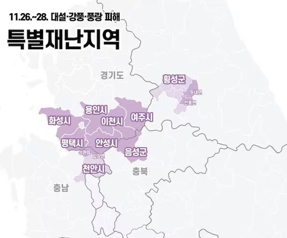피해 지역으로 지정된 곳은 경기도의 평택, 용신, 이천, 안성, 화성, 여주와 충북 음성이며, 읍·면 단위로는 강원도 횡성군의 안흥면과 둔내면, 충남 천안시의 성환읍과 입장면이 포함됐다. 이들 지역은 지난달 26일부터 28일까지 하루 최대 40cm가 넘는 폭설로 인해 농업시설을 중심으로 큰 피해를 입었다.