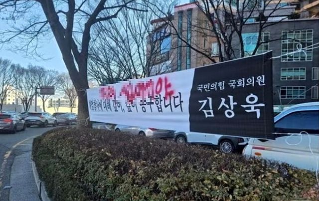 해당 현수막은 윤 대통령 탄핵안 표결이 있던 지난 14일 김 의원이 설치한 것이다. 현수막엔 ‘계엄 참사에 대해 깊이, 깊이 송구합니다’라는 문구가 적혀 있다. 경찰은 인근 폐쇄회로(CCTV) 분석 등을 통해 낙서한 범인을 찾고 있다.
