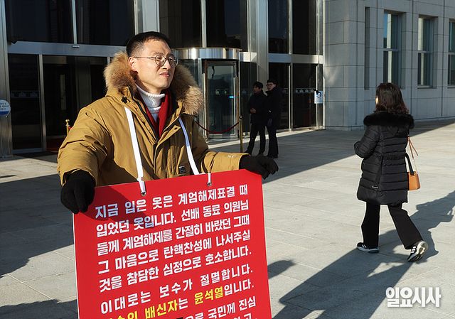 앞서 지난 7일 1차 탄핵안 표결 때는 당론을 어기고 표결에 참여했다. 2차 탄핵안 표결을 앞두고는 같은 당 의원들에게 탄핵 찬성을 촉구하는 1인 시위를 벌이기도 했다.
