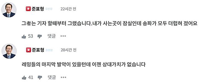 박 의원에 대해선 "그 者(놈 자)는 기자 할 때부터 그랬다. 내가 사는 곳이 잠실인데, 송파(박 의원 지역구)가 모두 더럽혀졌다"고 했다.