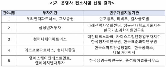 이번 선정은 12대 국가전략기술, 10대 초격차 분야, 탄소중립 등 핵심 기술분야에 대한 기술 지원 역량을 중심으로, 투자역량과 글로벌 네트워크 등의 사업지원 역량에 중점을 두고 평가하여, 상위 5개 컨소시엄을 최종 선정하였다.
