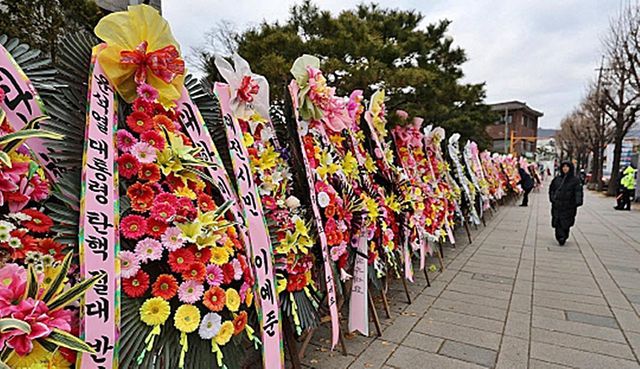 17일 오전 서울 종로구 헌법재판소 앞에 윤석열 대통령 지지 화환이 놓여 있다. / 연합뉴스
