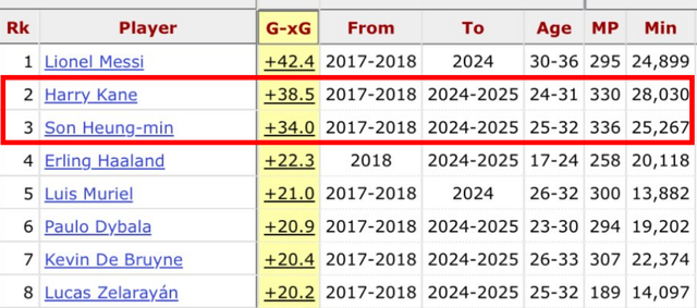 이 결과, 리오넬 메시가 42.2로 1위, 케인이 38.5로 2위, 손흥민이 34.0으로 3위를 차지했다. 엘링 홀란(22.3)이 손흥민에 크게 뒤진 채 4위인 것으로 나타났다. 손흥민의 경우 보통의 골결정력이었다면 넣었어야 하는 골보다 34골을 더 넣었다는 뜻이다. 케인과 손흥민의 골결정력이 그만큼 빼어났다는 뜻이 된다.