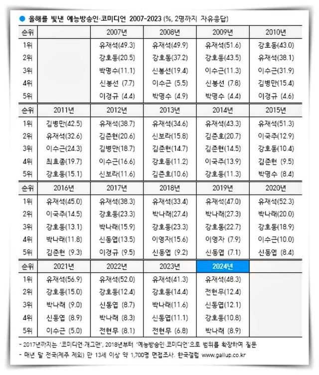 '올해를 빛낸 예능방송인·코미디언' 2007년~2024년 순위. / 한국갤럽 제공