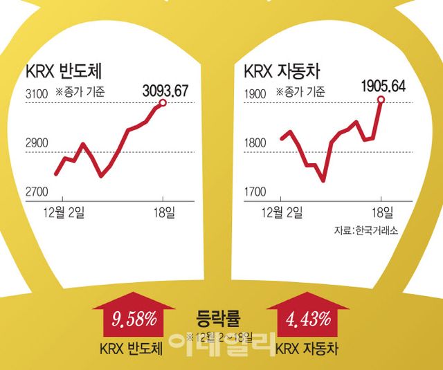 18일 한국거래소에 따르면 이달 들어(12월2~18일) KRX 반도체 지수는 9.58% 상승했다. KRX 자동차 지수는 4.43% 오름세를 보였다. 같은 기간 코스피는 1.16% 오른 것에 그쳤다. 반도체와 자동차 업종은 고환율 시기에 환차익 수혜가 예상되는 대표적인 수출주로, 기대감이 모이고 있는 것으로 풀이된다.