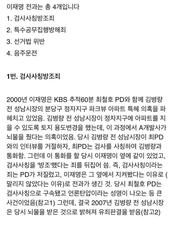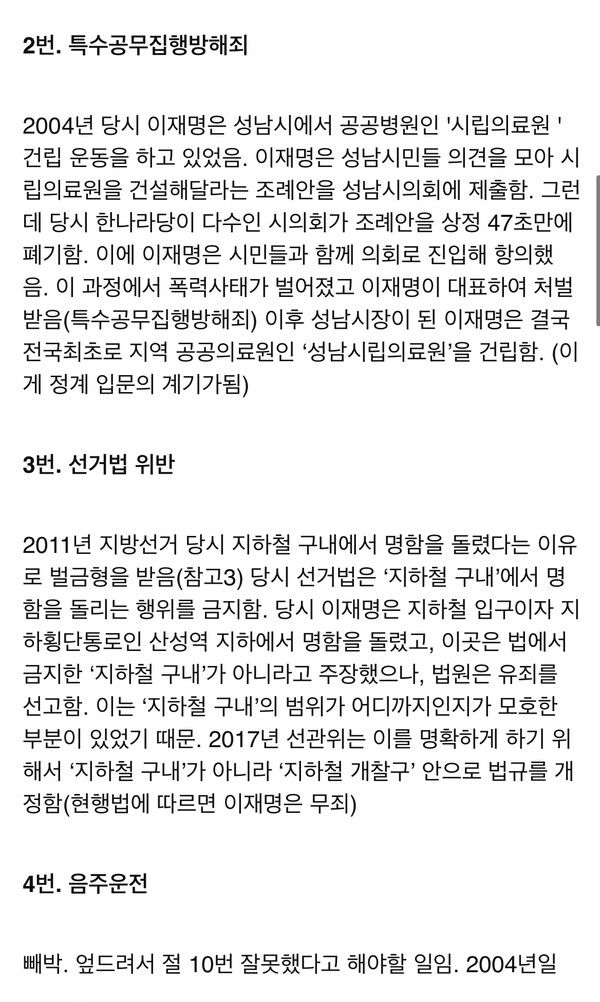 - 논란: 과거 이재명이 음주운전을 두 차례 이상 했다는 의혹이 제기되었으나, 그는 자신의 음주운전 전과가 한 번뿐임을 강조하며 범죄경력회보서를 공개했다.