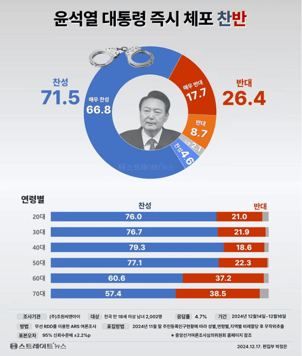 18일 조원씨앤아이가 스트레이트뉴스 의뢰를 받아 지난 14~16일 전국 성인 남녀 2002명을 대상으로 실시한 윤석열 대통령 즉시 체포 찬반 여론조사에 따르면 찬성을 택한 비율은 71.5%였고 반대는 26.4%였다.