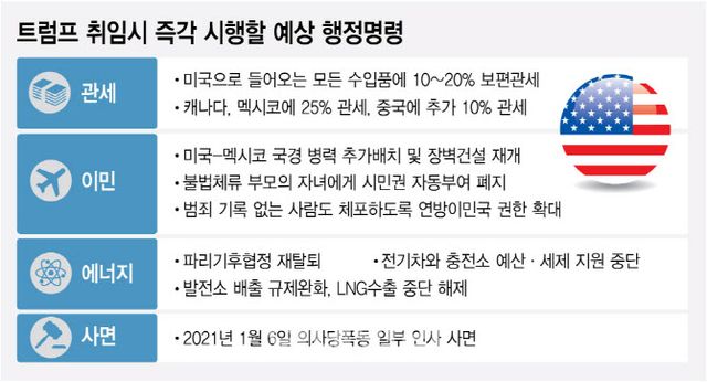 17일(현지시간) 로이터통신은 트럼프 당선인이 취임 첫날 최소 25개의 행정명령을 발표하고, 이후 며칠 늦어도 몇 주 이내에 더 많은 행정명령을 발표할 예정이라고 보도했다. 트럼프 당선인의 대표적인 공약인 ‘보편적 관세’(모든 수입국에 10~20% 관세 부과)를 비롯해 이민, 에너지, 사면 분야에서 대거 행정명령을 발표하며 ‘바이든 지우기’에 나설 것으로 예상된다.