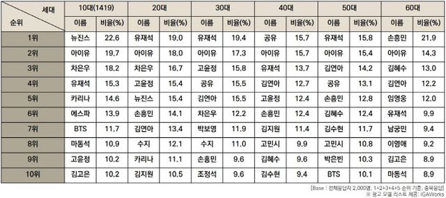 이번 조사에 따르면, 10대는 걸그룹 뉴진스를, 20~30대와 50대는 예능인 유재석을 꼽았다. 40대에서는 배우 공유와 가수 아이유가 가장 선호하는 광고모델인 것으로 나타났다. 반면 60대는 축구선수 손흥민을 가장 선호하는 광고모델로 꼽았다.